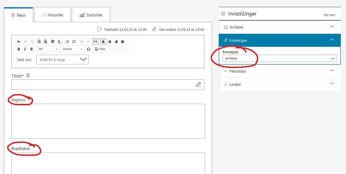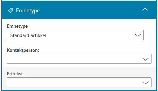 - Etter å ha valgt en emnetype for artikkelen vil du kunne knytte ulikt innhold til denne