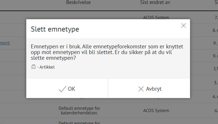 Merk! Denne teksten er forbeholdt brukere av ACOS CMS som har "Full tilgang" til å kunne redigere Emnetyper. Les mer om rettigheter og brukertilganger her. Dette er også regnet som "avansert funksjonalitet" som du bør ha en viss kjennskap til før du utfører noe her.