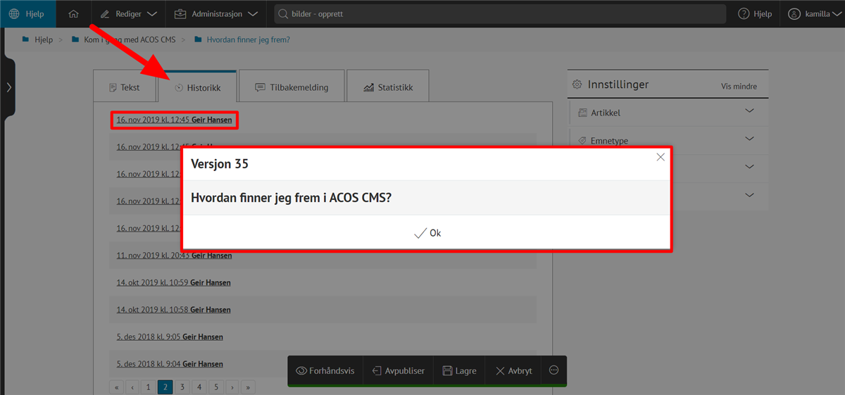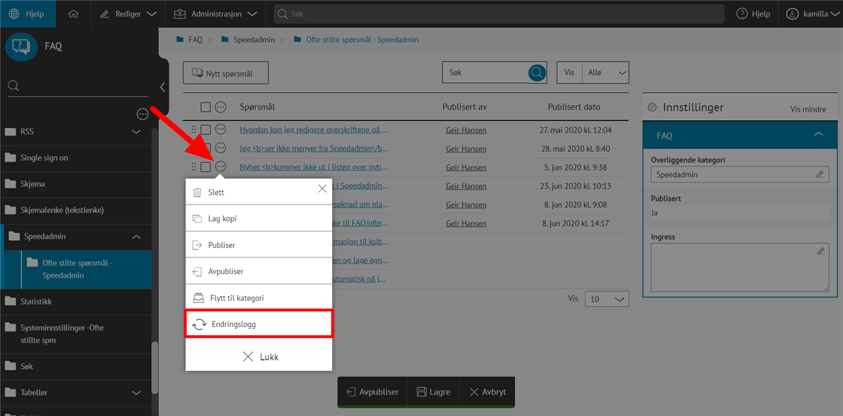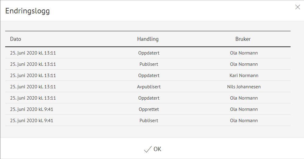 - Handling: Du kan se om noe er opprettet, oppdatert (lagret), publisert eller avpublisert