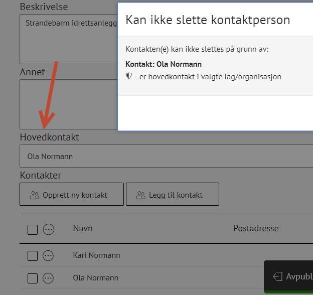 - Ønsker du likevel å slette kontaktpersonen må du velge en annen kontakt som hovedkontakt først:
