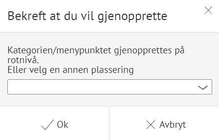 PapirkurvOm du er uheldig og sletter innhold kan du gjenopprette dette fra papirkurven. Innhold i papirkurven slettes automatisk 30 dager etter at elementet ble slettet fra modulen. Publisert av Geir Hansen Publisert 22.11.2017 12.11 Jeg har slettet en meny/menypunkt, hvordan gjenoppretter jeg denne ? Velg Administrasjon > Papirkurv I venstre marg, klikk på pilen ved siden av kategorien: Alt Markere kategorien Menypunkt Klikk flervalgsknapp ved menypunktet du slettet Velg Gjenopprett Klikk OK i dialogboksen for å godta gjenoppretting Godta plassering for gjenoppretting eller velg ny plassering Når jeg sletter/gjenoppretter et menypunktet, vil artiklene også følge med?Ja det vil de, du trenger ikke å slette/gjenopprette artiklene også. Hva kan jeg gjenopprette fra papirkurven? PapirkurvKan gjennopprettesKan ikke gjenopprettesArtiklerTilbakemeldingerMenypunktPersonerFAQImagemapFilBrukereBilderSaker i nabolagetEgendefinertDatakilderKartEmnetyperWebskjemaDesignVeiviserLayoutLenkerLag og organisasjonerOmrådemeldingSkjemaTidlsinjeWidgetsTabell Jeg har slettet et dokument i dokumentleseren, hvor finner jeg det? Gå til Administrasjon > Papirkurv Søk opp navnet på dokumentet i mappen Menypunkt. Kan jeg slette innhold i papirkurven?Ja du kan slette elementer permanent men ikke tømme hele papirkurven. Alle elementer som er slettet til papirkurven slettes imidlertid 30 dager etter at de ble slettet fra modulen. Slette et element permanent fra papirkurven: Gå til Administrasjon > Papirkurv Klikk på kategorien Alt, deretter velg kategorien elementet finnes i eller velg søk Klikk på flervalgsknapp (...) foran elementet i listen og klikk på Slett permanent Hvor lenge lagres innhold i papirkurven?Innhold lagres i papirkurven i 30 dager etter at det ble slettet. Deretter slettes det permanent Hva kan slettes/gjenoprettes fra papirkurven? PapirkurvKan slettes og gjenopprettesKan ikke gjenopprettesArtiklerTilbakemeldingerMenypunktPersonerBildeInnhold fra NabolagetLenkerEmnetyperOmrådemeldingDatakilderTabellKalenderhendelserTidslinjeBookingregler og ressurserWidgetGrupper og brukereWebskjemaDesignVeiviserLag og organisasjonerKart/kartpunktLayout