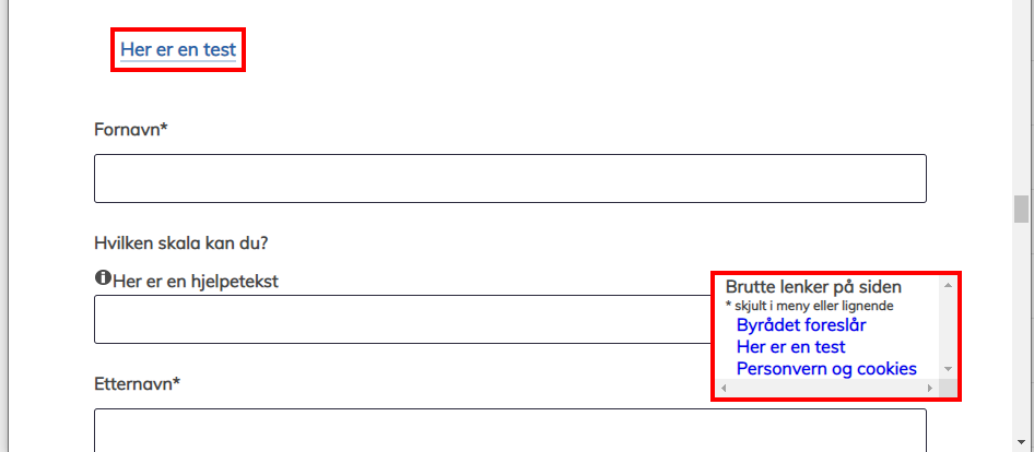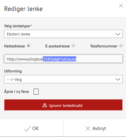 | 410 - Gone | Forespørselen kan ha mislyktes på grunn av et underliggende problem som nettverkstilkobling, DNS-feil, serversertifikatvalidering eller tidsavbrudd. Funksjonen som sjekker lenkebrudd benytter botter og flere nettsteder som fhi.no, regjeringen.no, lovdata.no, facebook.com, twitter.com, linkedin.com m.fl. ser ut som de ikke tillater botter på siden og returnerer da et lenkebrudd selv om lenke fungerer. | | |
