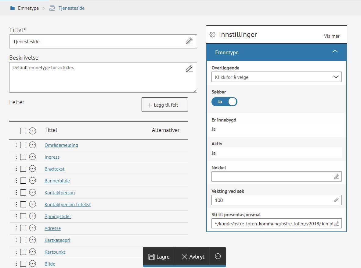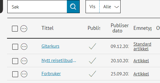 Nå er alle menypunkter av emnetypen Menyelement søkbare. Har du andre emnetyper for menypunkt, for eksempel en som heter "Transportside" eller "Informasjonsside"? Da må du sette disse også til søkbare hvis de skal vises i søkeresultatene.