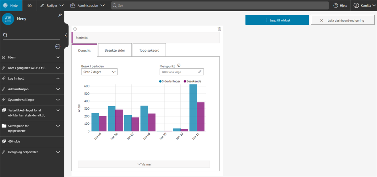 - Grafisk fremstilling av sidevisninger og besøkende