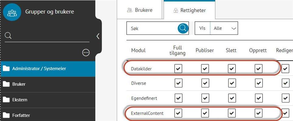 - Klikk på fanen Rettigheter og markere rettigheten External content og Datakilder og kryss av for Full tilgang