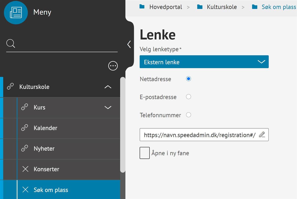 Vil du lenke fra et menypunkt til innlogging/søknad om plass: