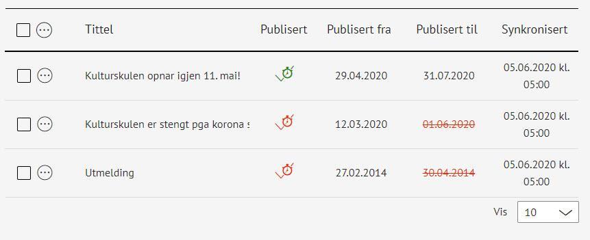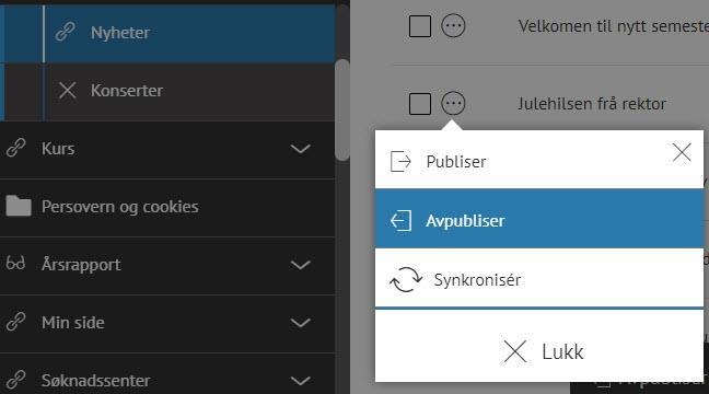 - Klikk på flervalgsknapp foran tittel i oversikt og velg avpubliser/publiser
