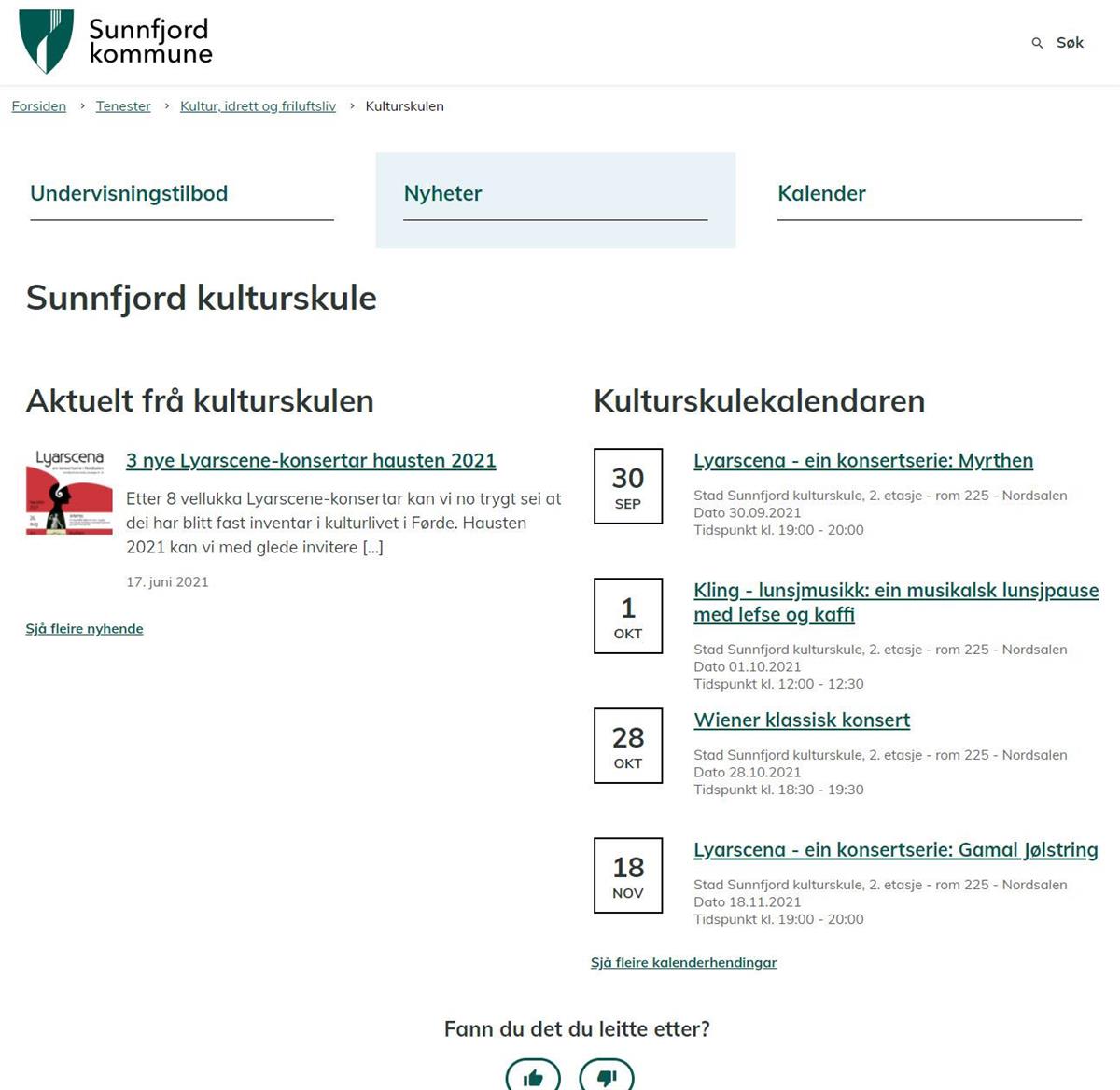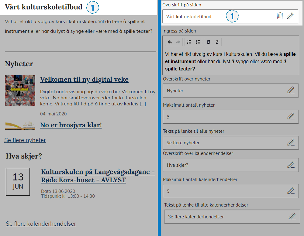 På forsiden kan du redigere overskrifter, lenketekster, bestemme antall nyheter eller hendelser i kalender