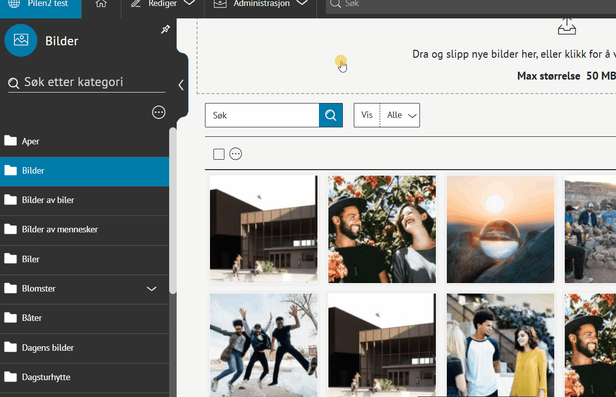 Bilder og video fra MediaflowVia denne integrasjonen, kan du importere bilder og videoer fra Mediaflow. Publisert av Geir Hansen Publisert 16.01.2025 10.50 Bilder fra Mediaflow har samme bruksområde som bilder fra bildemodulen i ACOS CMS Hvodan setter jeg inn et nytt bilde fra Mediaflow?Gå til Artikkel eller modul du vil sette inn et bilde fra MediaflowVelg Sett inn > Bilde fra sett-inn menyenKlikk på Last opp bilderVelg å laste opp bilde fra Mediaflow I pop-up fra Mediaflow, markere mappe med bilder og klikk på bilde du ønsker å laste opp Klikk på knappen Bruk denne filenVelg bildekategori eller klikk på +Ny kategori for å plassere bildeKlikk OKVelg om du vil legge til/endre Tittel, Bildetekst, Alt tekst og FotografVelg bredde og plassering. Ønsker du å beskjære bildet, klikk på blyant-ikon Klikk FerdigEllerGå til Rediger > BilderVelg en kategori til venstreKlikk på Opplastingsfeltet øverstVelg bilde fra Mediaflow I Mediaflow velger du bilde du ønsker å laste opp Klikk på knappen Bruk denne filenVelg om du vil legge til/endre Tittel, Bildetekst, Alt tekst og FotografKlikk Last oppBildet er nå klart til å brukes og kan settes inn i artikler over hele nettstedet. Merk at bilder fra Mediaflow kan behandles i CMS'et på samme måte som andre bilder. Hvordan setter jeg inn video fra Mediaflow? I artikkel, velg sett inn > WidgetVelg > Opprett nyAngi en tittel på din widdetVelg Video fra Mediaflow i feltet TypeUnder Innstillinger, klikk på Legg til og velg en kategori > OKKlikk PubliserKlikk Lagre/Publiser i artikkel Tips: For å holde orden i bildene dine, anbefaler vi at alle bildene du laster opp fra Mediaflow, lagres i en egen kategori.