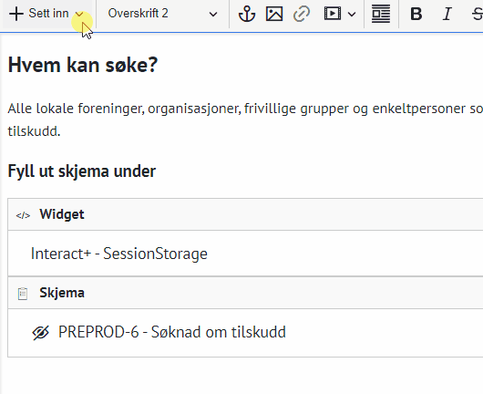 - Skjema må være publisert i Interact+ for at det skal vise i listen over skjema som kan settes inn