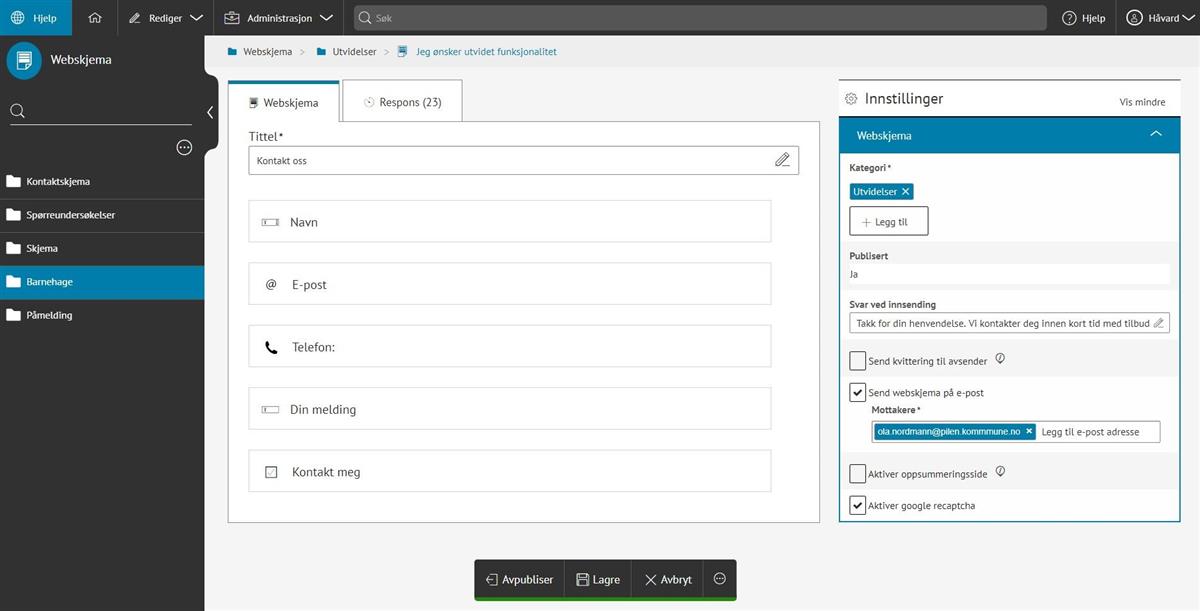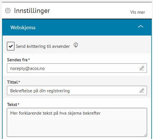 Du kan også motta innsendte skjema på e-post ved å endre Innstillingene til høyre i webskjemaet. Se punktet "Opprett et webskjema".