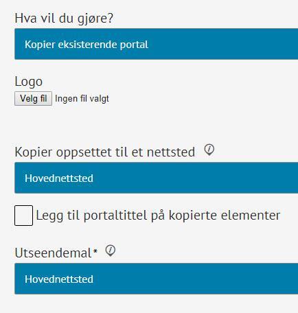 - Fyll ut feltene. Om du ønsker samme design som på hovednettstedet velg Kopier eksisterende portal under Hva vil du gjøre?