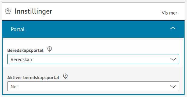 - Under Innstillinger og Portal finner du felt Beredskapsportal, her velger du nettstedet som skal "overta" når en beredskapssituasjon inntreffer