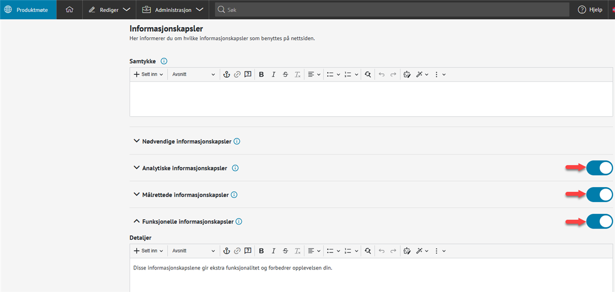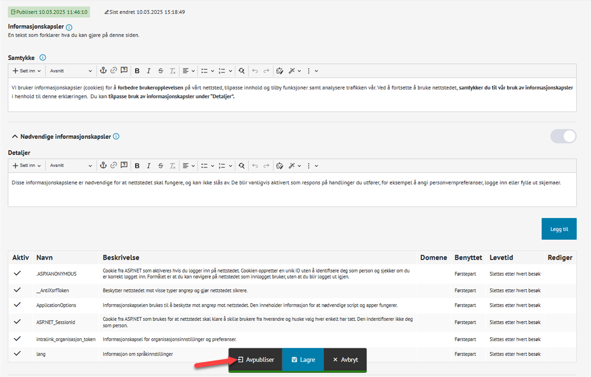 - Nødvendige informasjonskapsler : Disse er essensielle for at du skal kunne bruke våre nettsider. De gjør det mulig å navigere rundt på sidene og bruke grunnleggende funksjoner som sikker tilgang til lukkede områder.