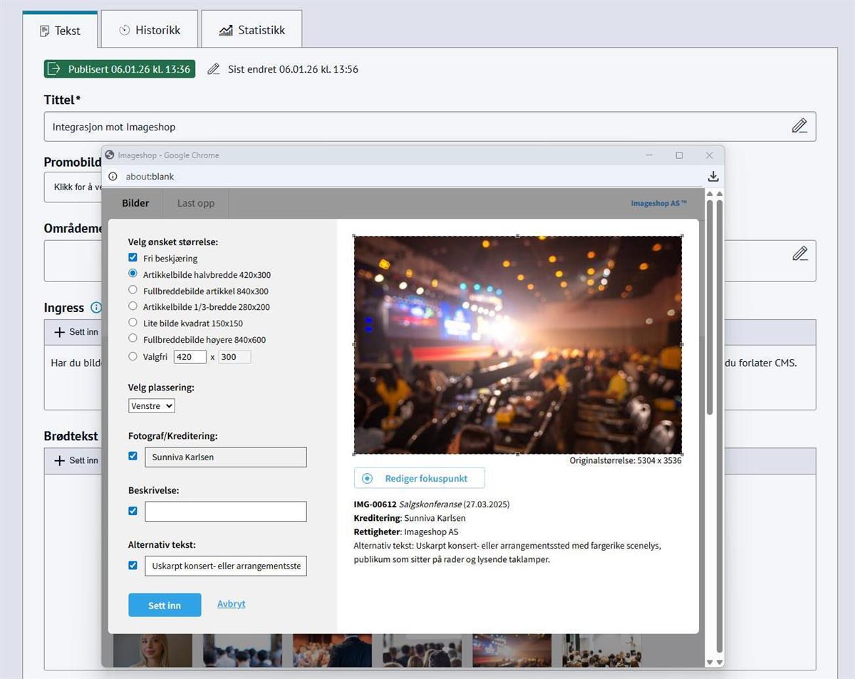- Sett inn bilder og video fra Imageshop i artikler og på andre sider som har bildefelt