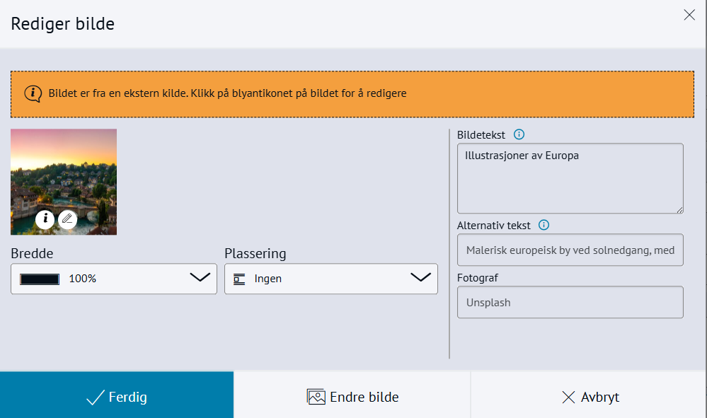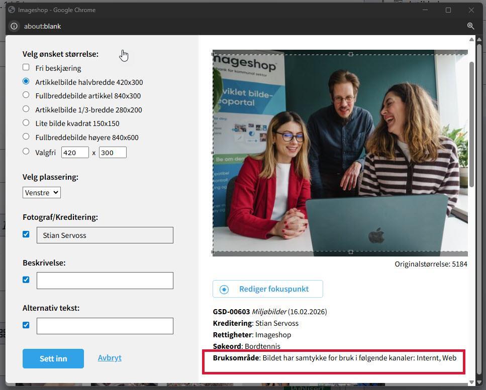 Når du setter inn bilde vises informasjon om Bruksområde som forteller om det har nødvendig samtykke for å benyttes på nettsidenIntegrasjonen i bruk