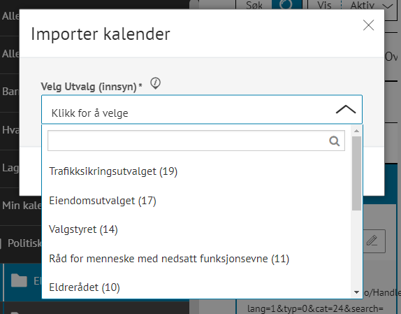 Vis møter fra Innsyn i kalenderI kalendermodulen settes det opp en kobling som gjør at det er mulig å velge hvilke utvalg det skal vises møter fra i Innsyn. Disse viser i kalender sammen med andre hendelser som publiseres Publisert av Geir Hansen Publisert 27.02.2024 15.57 I kalenderkategori under Rediger > Kalender velges det utvalg en vil viser møter fra