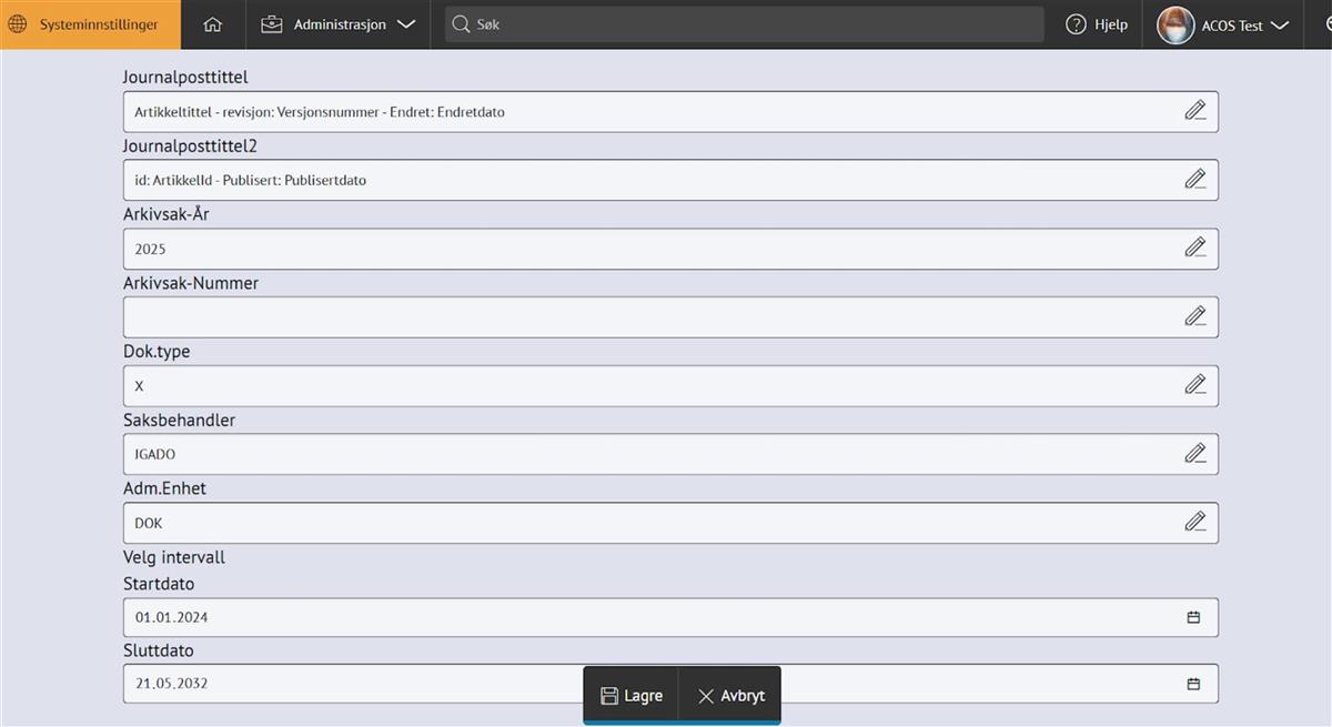 Arkivering av artikler til WebSakØnsker dere en enkel og automatisert løsning for å bevare verdifullt innhold? Vår modul for arkivering av artikler fra ACOS CMS til WebSak er svaret! Publisert av Geir Hansen Publisert 20.11.2024 12.36 Jeg ønsker tilbudHva sier arkivloven?Arkivloven krever at informasjon med forvaltningsmessig eller historisk verdi arkiveres, uavhengig av format – dette inkluderer innhold på offentlige nettsider. Modulen sørger for at dere møter disse kravene automatisk.Artikler i CMS til Websak Hvordan fungerer det?Du lager en ny arkivsak i WebSak og sender saksnr. til ossVi legger inn standardinnstillinger for arkivering, som du selv kan endre på senereArkivering fra nettsiden til WebSak går via ACOS Mottak Arkiveringen skjer automatisk 1 gang i døgnet (kan skje oftere om ønskelig) Endringer i artikkelen lagres som en ny versjon, neste gang arkiveringen kjører I ACOS CMS:I WebsakArtiklene dine vil du finne igjen som journalposter i saken. Her anbefaler vi at du setter opp en sak pr. år. Dette kan du selv bestemme.Skjermbilde som viser arkiverte artikler i Websak Hva arkiveres? Publiserte artikler Endringer du gjør i artikkel vil lagres som en ny journalpost Innholdet i artikkelen (bilder, filer, webskjema, lenker i artikkel)Hvilke gevinster oppnår du? Unngå informasjonstap og overhold arkivloven Når modulen er satt opp, arkiveres artikler automatisk- ingen manuell oppfølging.Sikre digital kulturarv - bevar viktig informasjon for ettertiden. Artikler med historisk eller forvaltningsmessig verdi blir trygt lagret og tilgjengelig i WebSak Finn enkelt igjen eldre artikler og tidligere publisert innhold direkte i WebSak, organisert som journalposter i den saken dere definerer. Rydd med trygghet - Når artikler er forsvarlig arkivert i WebSak, kan dere med større trygghet avpublisere eller slette utdatert innhold, og du holder nettsidene relevant og brukervennlige, uten å miste historisk dokumentasjon. Har du et slankt nettsted bidrar du også til en mer bærekraftig og miljøvennlig nettside, som laster raskere og er enklere å vedlikeholde.Forutsetninger Løsningen gjelder for arkivering av artikler til WebSak, ikke andre sak- og arkivsystem. Dette arkiveres ikke: Informasjon som er knyttet til artikkelen, som lenker i høyre marg, kommentarer, skreddersøm av presentasjon av bilderHvem er dette for?Alle våre ACOS CMS-kunder som benytter WebSak som ønsker en effektiv og automatisert løsning for å ta vare på verdifullt innhold fra nettsidene. Invester i trygghet, effektivitet og etterlevelse!Jeg ønsker tilbud på arkivering av artikler til Websak